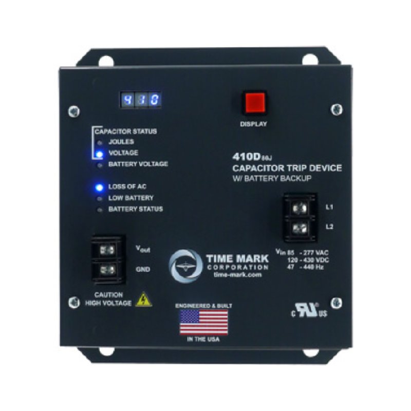 The 410D-80J is an auto-charged capacitor trip device that has a stored capacity of 80.8J at 380V and can maintain a full charge for 48 hours. It has a voltage range of 85-277VAC or 120-430VDC.