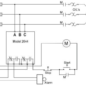 The voltage adjustment range allows for proper calibration to existing conditions. Both TRIP and NORM indicators are provided to aid in adjustment and system troubleshooting. The B2644 model comes with an automatic reset. The Model B2644 Monitor is not sensitive to line current, and can be used with any size motor or compressor.