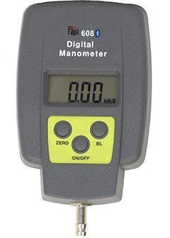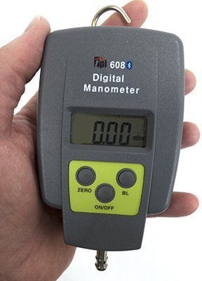 The 608BT Digital Manometer with Bluetooth® Communication measures pressure or vacuum in four units of measure. Single input manometer with +/-150mBar range. Four units of measure: inH2O, mBar, KPa, PSI and mmH20. Backlight display.