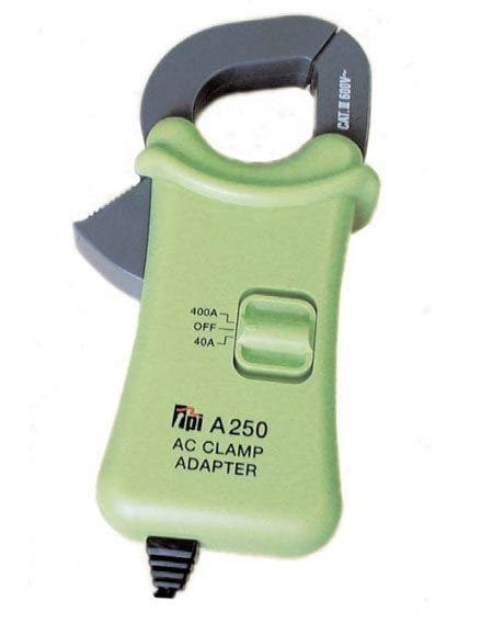 The A250 turns your Digital Multimeter into a clamp-on current probe enabling you to safely measure current above 10 amps. The output of the adapter is 1mA AC per amp. The A250 will work with all TPI DMM’s having up to 400mA AC input range.