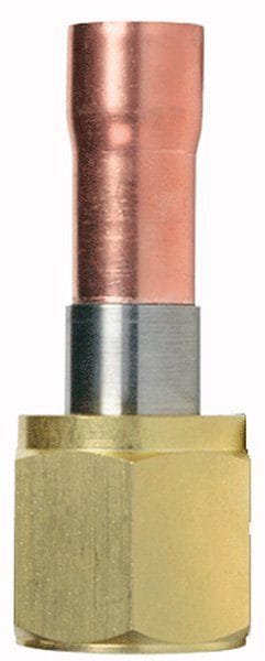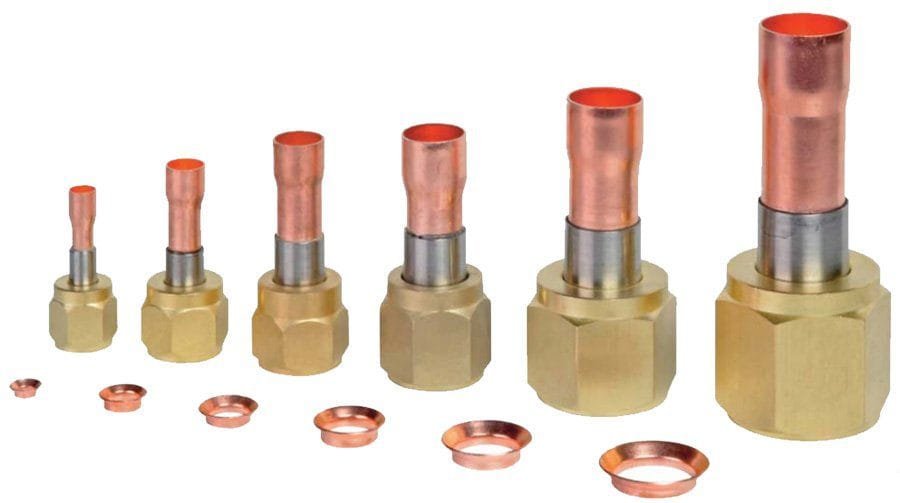 Ensure leak free connections (especially for R410a) with the Flexflair series patented flare connector. The Flexflair series flare connector utilizes a renewable copper trumpet ring and a stainless steel core, which eliminates deformities or cracks that occur when traditional standard copper tube is flared. The unique construction of the Flexflair series flare adapter avoids tension and force on the “flare-connection.” By simply replacing the copper trumpet ring after component change-out the Flexflair series flare connector can be used over and over with leak proof results.