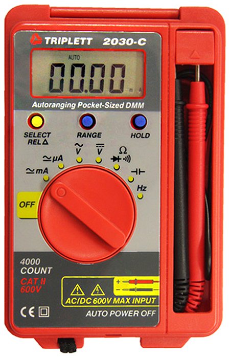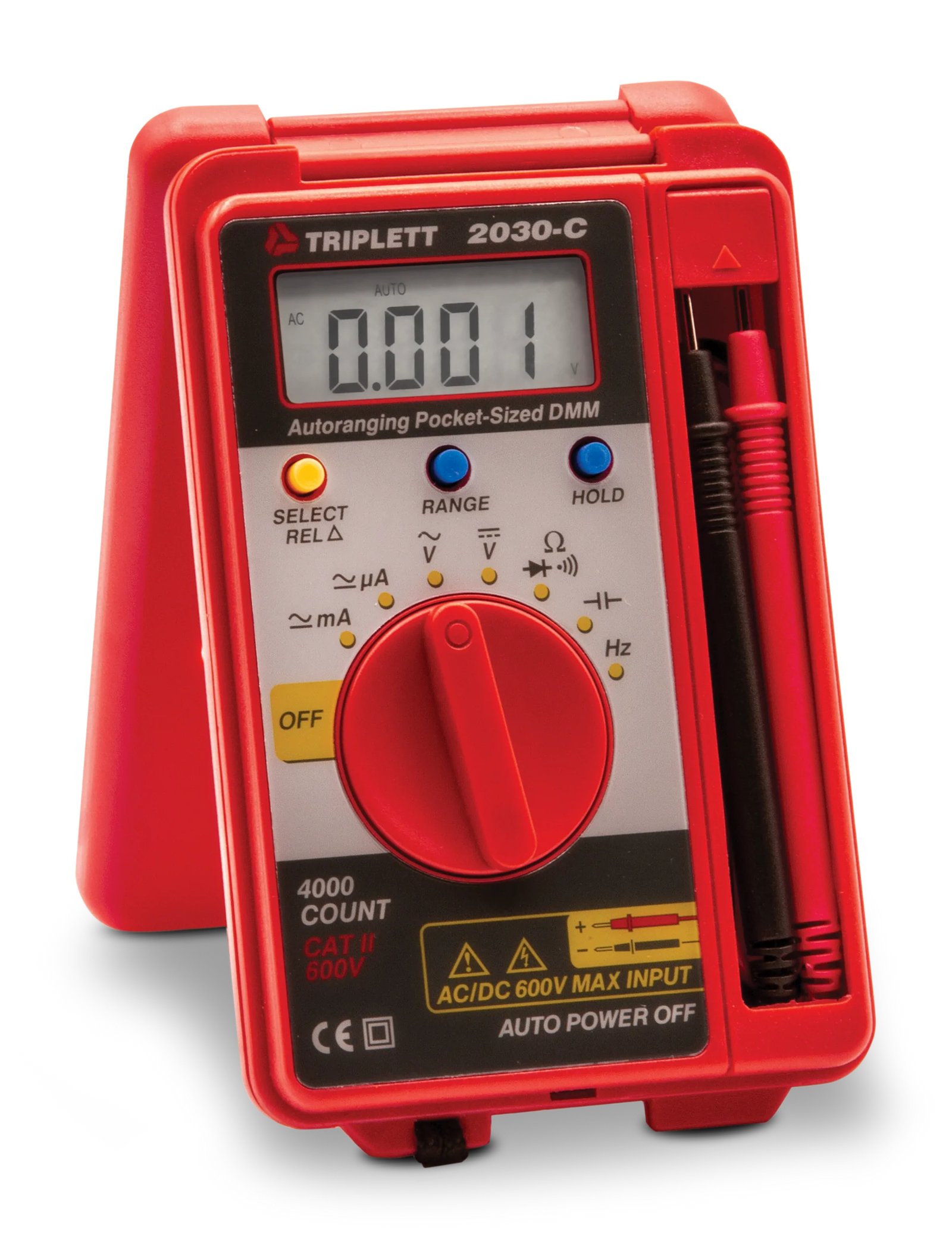 The Triplett Model 2030-C is a 3-3/4 digit (4000 count) pocket sized digital multimeter with a built-in hard case. It offers a variety of measurement features including AC/DC Voltage, AC/DC Current, Resistance, Continuity, Diode Test, Frequency, and Capacitance. The ABS plastic housing provides impact and drop resistance in an ergonomic design, and the user-friendly Auto Power Off feature helps maximizes battery life. With an industry standard CAT II design that provides resistance to damage from transient overvoltages in any settings. The Model 2030-C is suited for a variety of commercial and residential applications such as security, home theater, electrical, HVAC installations and more.