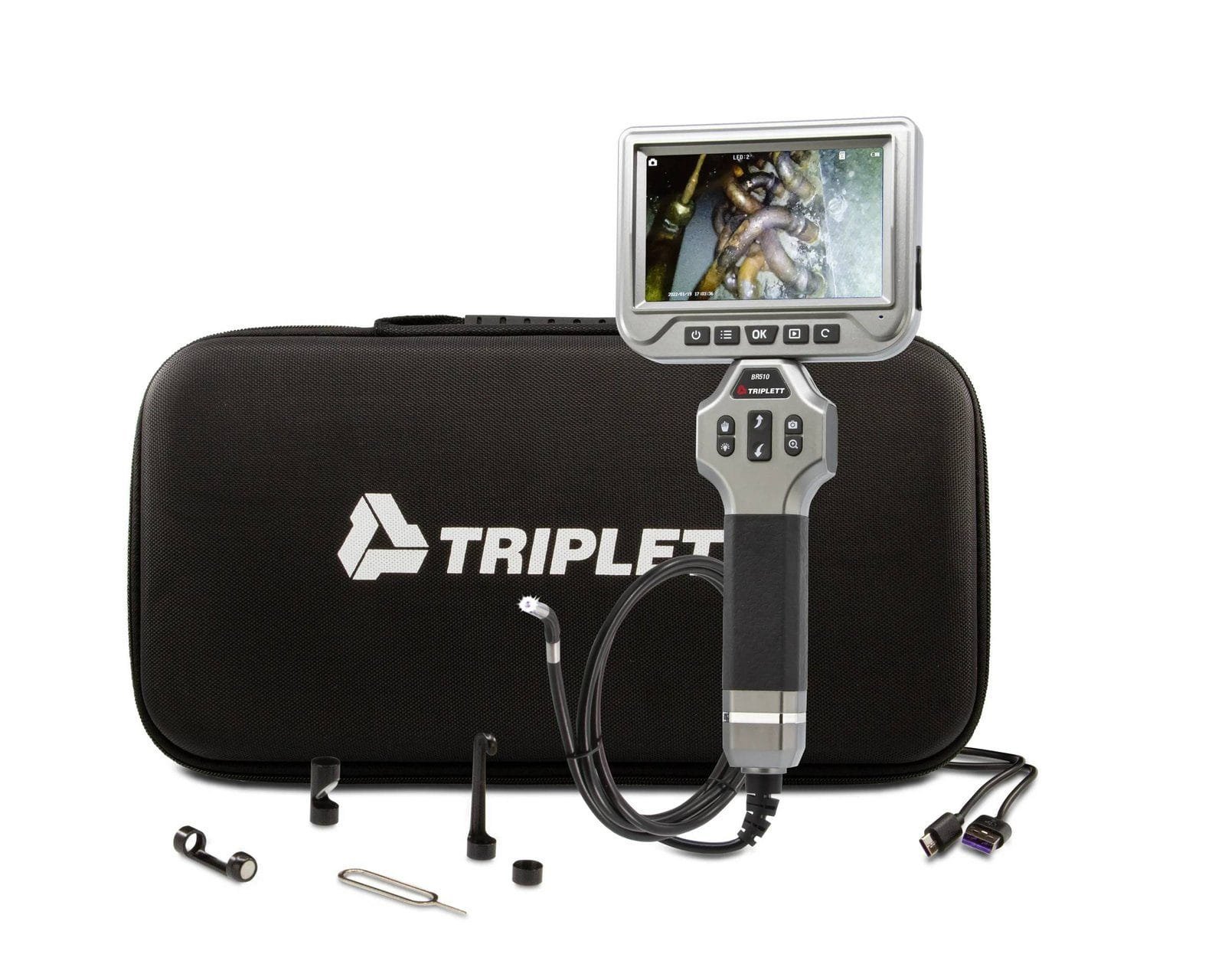 The Triplett BR510 high-definition articulating borescope inspection camera allows you to see behind walls and down drains, which can save time and money on a repair or installation. It has a 6mm waterproof (IP67) camera with a two-way articulating probe that adjusts 180° in both directions. Six adjustable LEDs with three brightness levels can illuminate totally darkened areas for inspection. It features a five-inch color TFT LCD monitor with 1920 x 1080 resolution, a built-in clock/calendar, and the ability to record video (.AVI) and capture images (.JPG). View video and images on the display or transfer to your PC using the USB interface or a removable SD card. You can store up to 19k images or 20 minutes of video (three-minute files) on the included 4GB SD card. Video recording mode features a freeze function. Includes borescope, 1.5m articulating probe with 6mm camera, 5V Li-Po (lithium-polymer) rechargeable battery, microSD card, USB cable, and camera accessories (magnet, hook, protective cap).