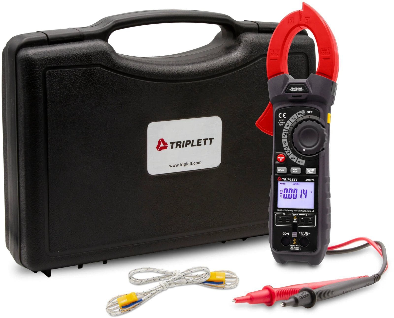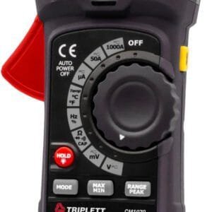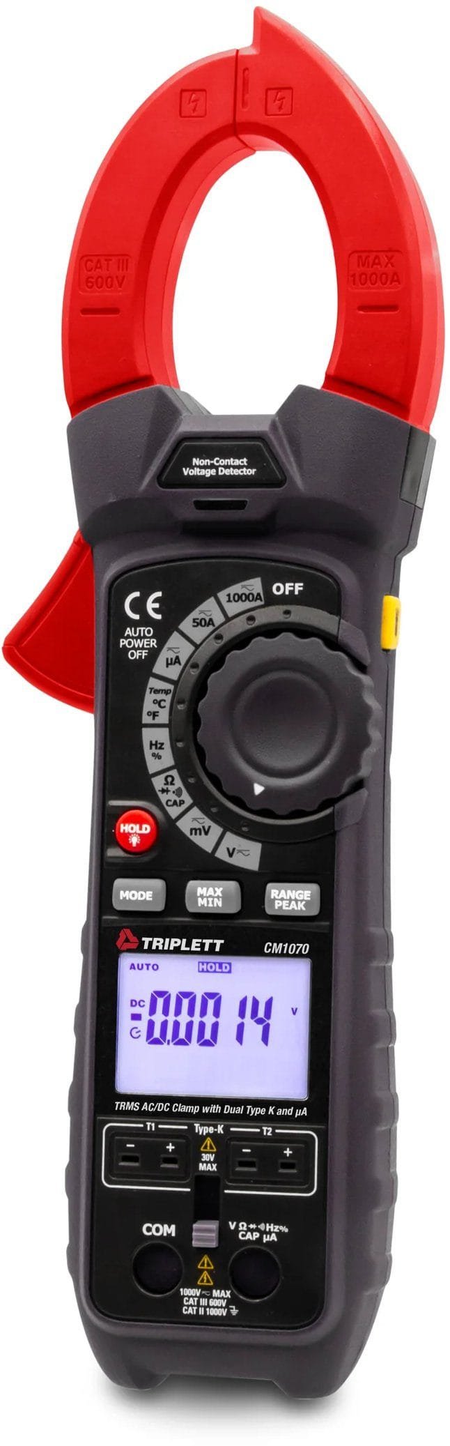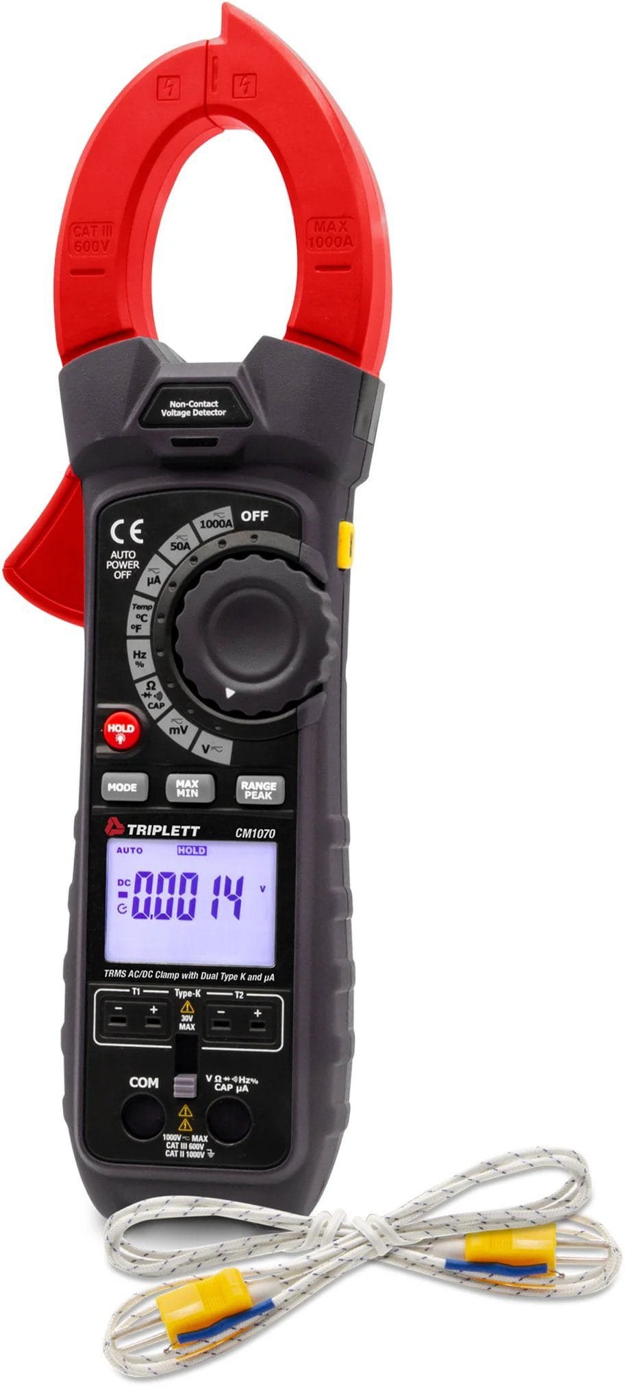 The Triplett CM1070-NIST is a true RMS clamp meter that can measure AC and DC current up to 1000A without breaking the circuit by clamping around a single conductor. This model includes a Certificate of Traceability to NIST. True RMS provides better accuracy when measuring non-sinusoidal or noisy waveforms. The CM1070 also includes Dual Type-K input for superheat and differential temperature measurement and uA current for HVAC flame rod measurement.