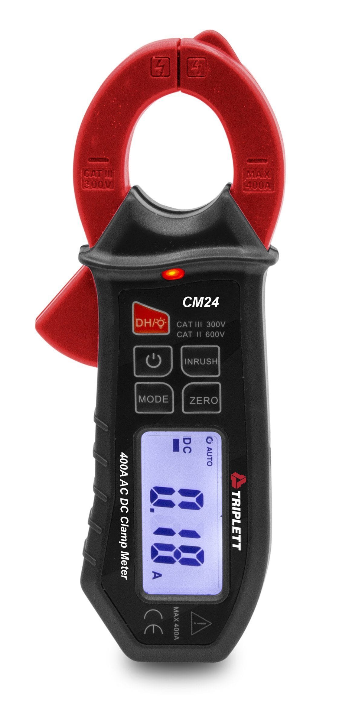 The Triplett Model CM24 True RMS Mini Clamp Meter can measure AC and DC current to up 400A without breaking the circuit by clamping around a single conductor. This saves time and the circuit will not be damaged. True RMS provides better accuracy when measuring non-sinusoidal or noisy waveforms. Measurements can read on the 4000 count backlit LCD. It has an Inrush current function that captures the instantaneous surge (inrush) current when power equipment is turned on. Additional features include: a built-in NCV detector with LED, DC zero function, over range indication, and Auto power off. Data Hold freezes the display for easy viewing. CAT III-300V safety category. 1-year warranty.