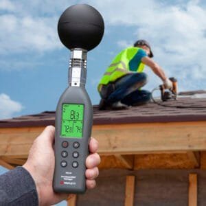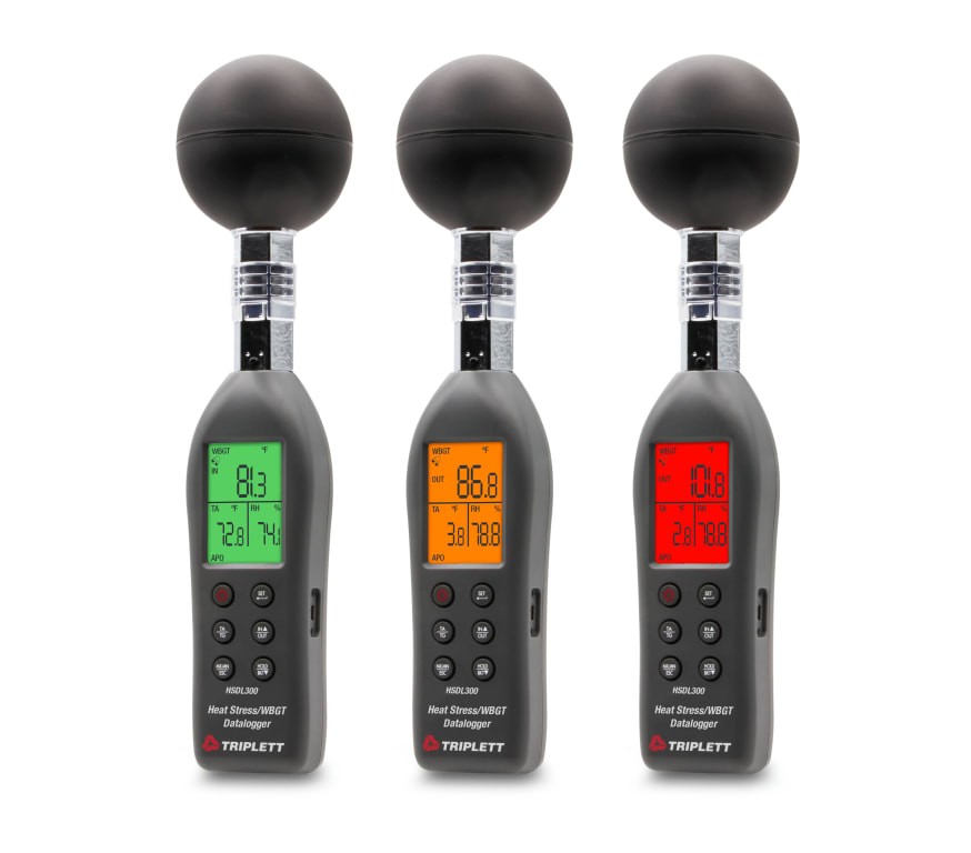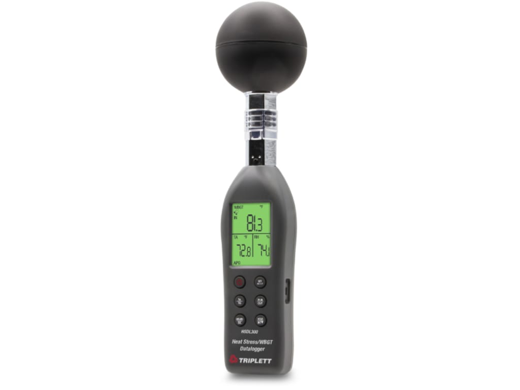 The Triplett HSDL300 is a heat stress WBGT (Wet Bulb Globe Temperature) meter that monitors indoor or outdoor heat stress to help limit the danger of heat-related injury. It simultaneously displays air temperature or globe temperature, humidity, and WBGT. The HSDL300’s memory stores up to 12,000 readings, each containing air temperature, humidity, WBGT, and globe temperature. Stored readings are transferred to a PC via a USB interface.