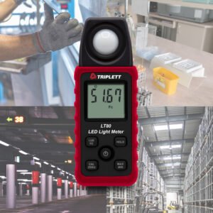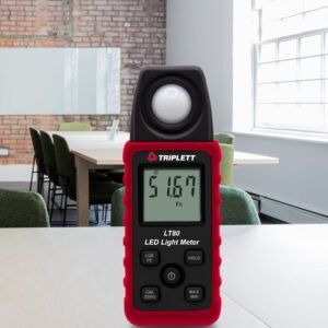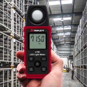 The Triplett Model LT80 LED Light Meter measures light intensity and verify OSHA safety requirements from white LED light sources up to 40k Foot candles (400k Lux. ) now being incorporated in factories, parking lots, schools, offices, transportation lines, warehouses, hospitals, schools, and many other environments. It will also measure light from fluorescent, metal halide, high‐ pressure sodium, and incandescent sources. It features a 4000 count LCD display, silicon photodiode sensor with spectral response filter, Min/Max/Avg function that recalls the highest, lowest and average reading, Data Hold to freeze the reading on the display for easy viewing, and auto power off (with disable) to conserve battery life. Includes 2 AAA batteries and pouch case. 1-year warranty.