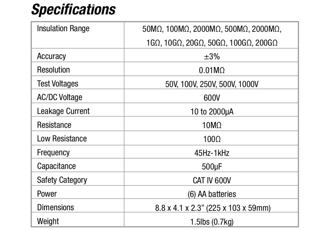 - Complete Package – The insulation tester includes test leads, test probes, a remote control probe, alligator clips, (6) AA batteries, and a durable carrying case