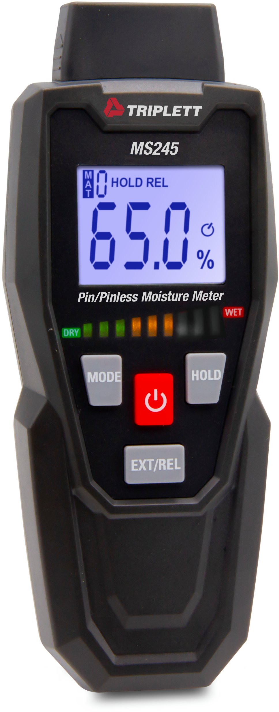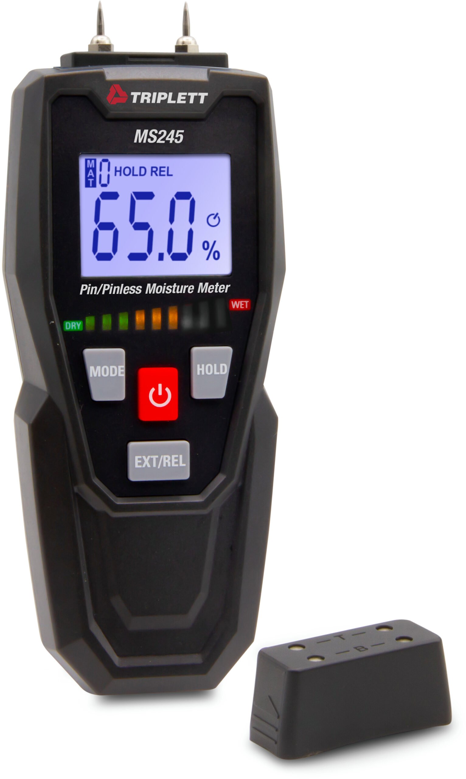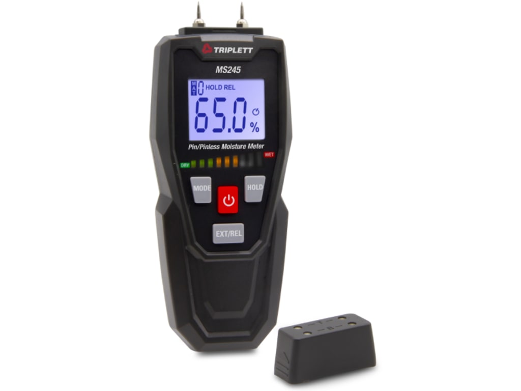The Triplett MS245 is a moisture meter with two pin measurement or ten pinless, non-invasive measurement selections. The pin/pinless meter offers versatility and convenience to measure moisture content in wood (6 to 99%) and other building materials (0 to 100%). Audible and visual moisture alerts along with green, yellow, and red LEDs provide easy interpretation of low, medium, and high moisture levels.