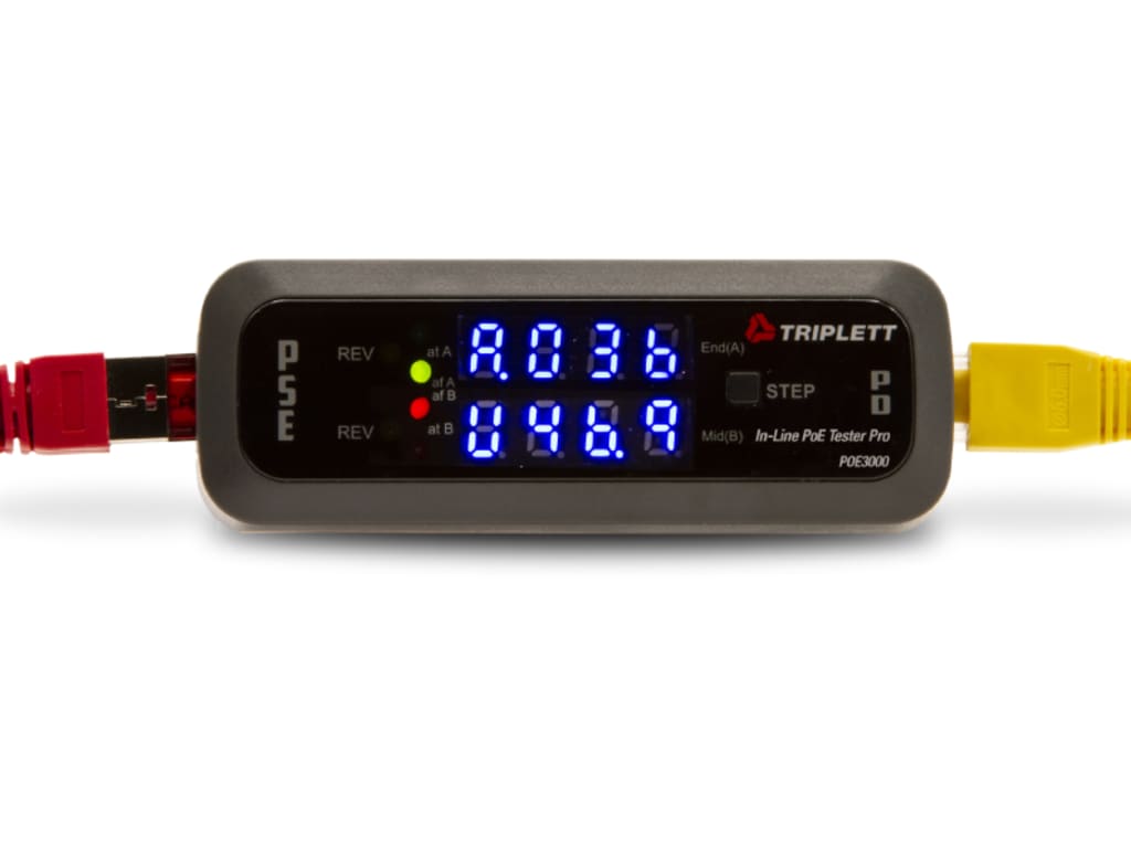 The Triplett POE3000 In-Line PoE Tester Pro is a valuable tool that streamlines the installation and troubleshooting of PoE (Power over Ethernet) system devices. It simplifies the process by offering various detection capabilities. The tester’s 4 LEDs indicate whether it complies with IEEE802.3af or 802.3at/bt standards. It can detect PSE (Power Sourcing Equipment) type/class, power source, polarity, voltage, current, and power, and determine if it is End Span (1/2, 3/6), Midspan (4/5, 7/8), or across all 4 pairs. For added convenience, the tester can differentiate between standard PoE (36 to 60V) and non-standard (11 to 60V) passive PoE, making it suitable for various PoE setups. It also includes 2 yellow LEDs to indicate reversed polarity for power type.