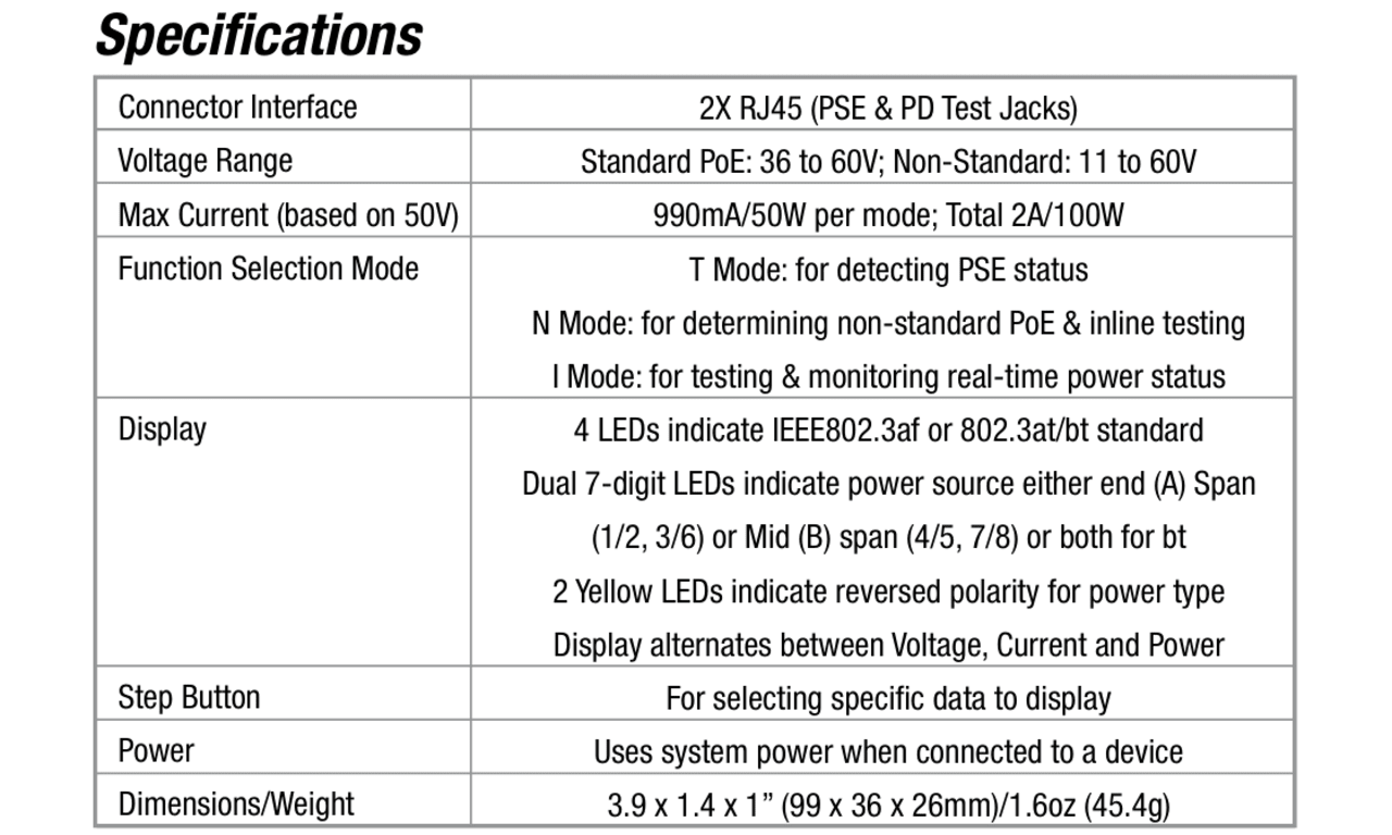 - Comprehensive Detection – Detects PSE-type/class, power source, polarity, voltage, current, and power, and determines End Span, Midspan, or across all 4 pairs