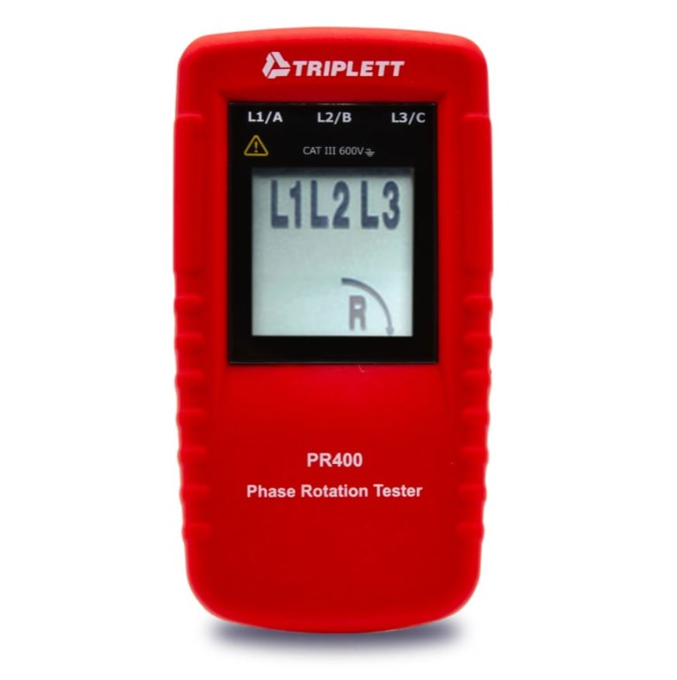 The Triplett Model PR400 determines correct phase wiring sequence (L1, L2, L3) for 3-phase system installations. Color-coded test leads are provided for connecting to the three mains phases of the system under test. You can view results on an easy-to-read graphical display to see phase direction (clockwise/counter-clockwise) and which phases are live.No battery is required. CAT III 600V safety category. 1-year warranty.