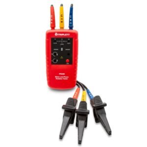 The Triplett Model PR450 determines correct phase wiring sequence (L1, L2, L3) for 3-phase system installations and determines contact or non-contact motor-rotation direction. Color-coded test leads are provided for connecting to the system or motor under test. LEDs display phase direction/rotation (clockwise/counter-clockwise) and which phases are live. CAT III-600V safety rating. 1-year warranty.