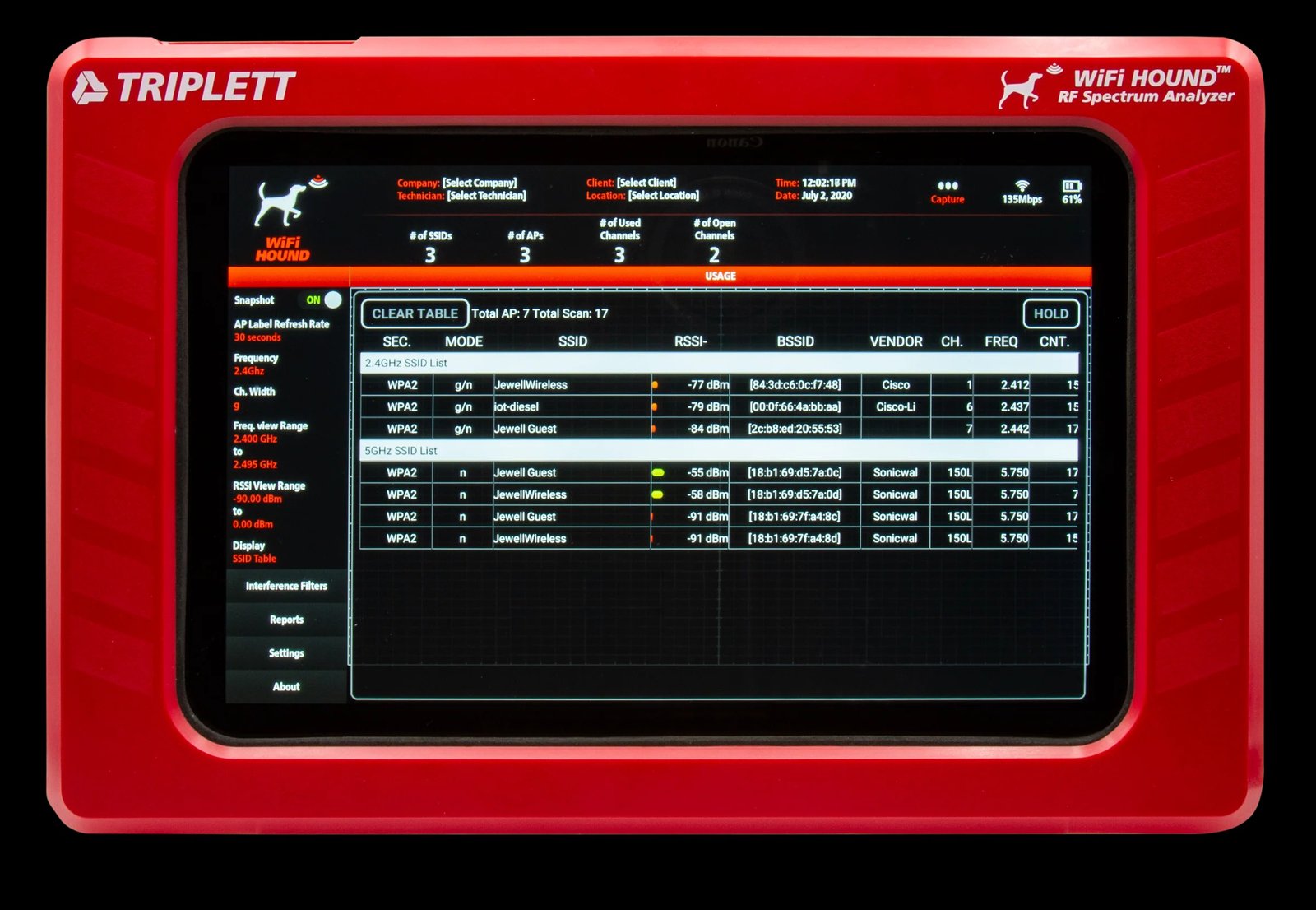 - Advanced Filters – Select specific wireless channel, adjustable RSSI view range, focus by Mac address, show broadcast type (n, g, ac, etc.), show channel number