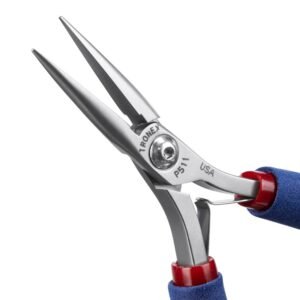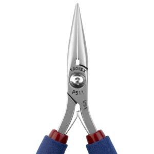 Chain nose pliers are commonly used in electronic assembly and rework and in fine jewelry and beading work. Tronex chain nose pliers feature a very fine tip (.060″ x .050″), “eased” inner edges, and extended gripping power. Tronex chain nose pliers can have either flat-faced inner jaws or serrated (search by 512/712) inner jaws. Our 511/711 models feature smooth inner jaws.