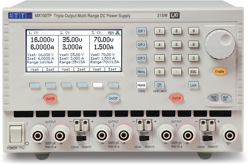 | Unique Features | Three high performance outputs of 105 watts each 3 x (0 to 35V at 0 to 3A) Total power of 315 watts in a highly compact package Range switching gives up to 70 volts and up to 6 amps Twelve range combinations for maximum flexibility Up to 210 watts from a single output RS-232, USB and LAN (LXI) interfaces |
