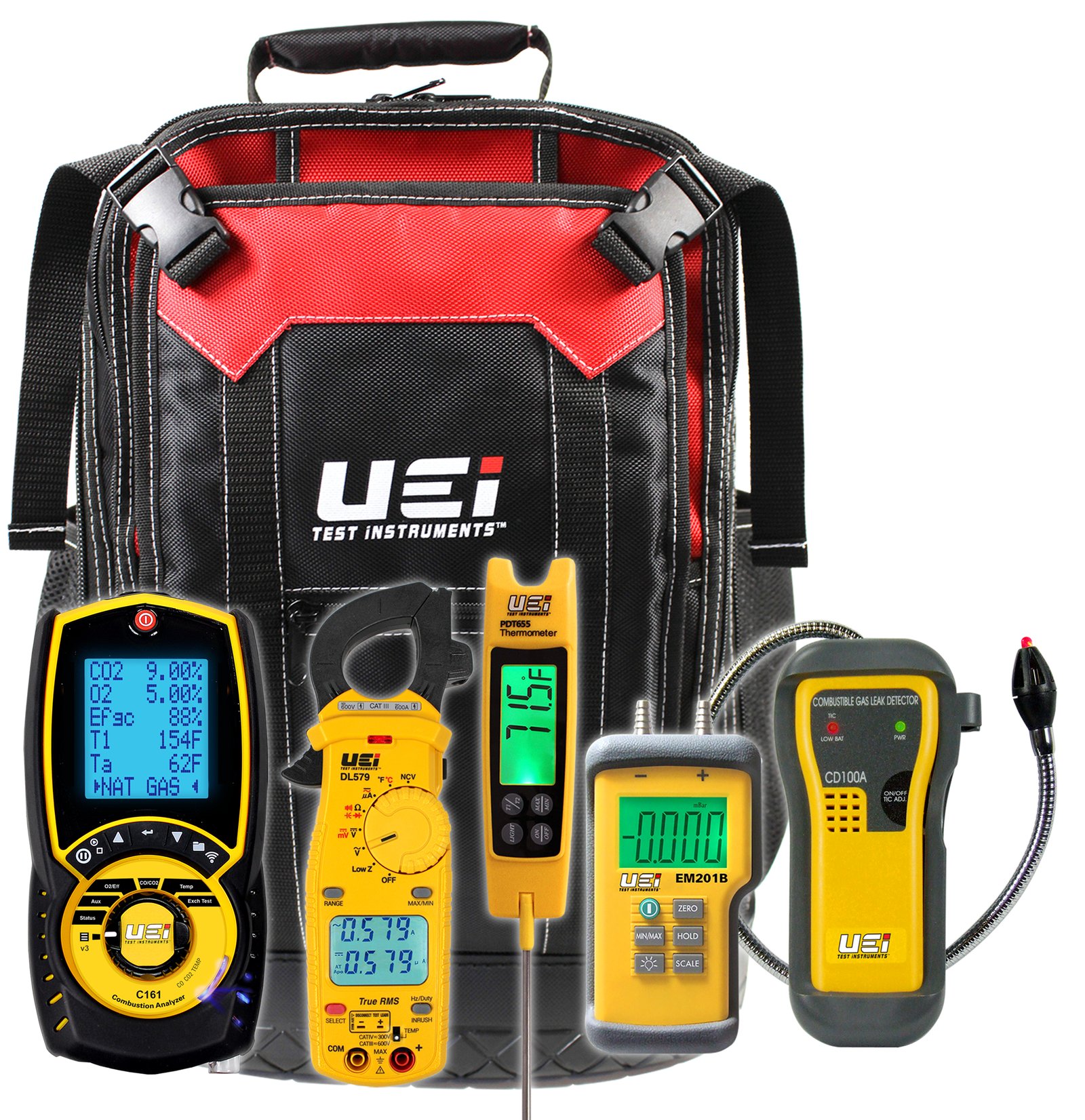 - Kit includes Combustion Analyzer (C161OIL), True RMS Clamp Meter (DL579), Combustible Leak Detector (CD100A), Static Pressure Manometer (EM201SPKIT), Differential Folding Thermometer (PDT655), Smoke Pump Test Kit (SPT1)UEi Tool Backpack (AC550)