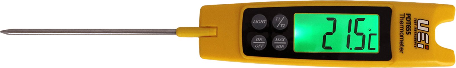 The UEi PDT655 Differential Folding Pocket Thermometer has a temperature measurement range of -58 to 572°F (-50 to 300°C). The PDT655 calculates differential temperature and will display temperature at either °F or °C on the large, easy-to-read backlit display. The UEi PDT655 features a back-fold out probe and will take readings whether it is open or closed.
