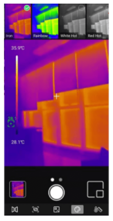 In the main interface, tap the palette button, and the optional palettes will show on top of the screen, including Ironbow, Rainbow, White Hot, Red Hot, Black Hot, Lava, and Rainbow HC.