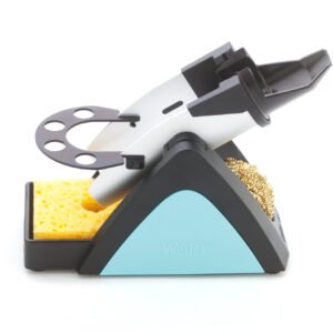 The soldering iron holder is reversable, allowing the user to choose between wet and dry tip cleaning. With the removal of the blue side plates, two or more safety rests can be bolted together, adding stability and conserving workbench space.