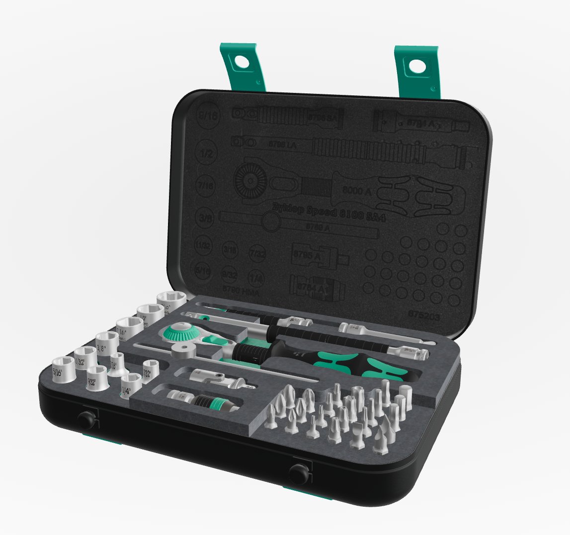 Perfectly conceived in every detail: the storage case for the Zyklop Speed ratchet sets! The two-tone foam insert section means that the tools can be quickly and reliably replaced, and that missing tools can be detected immediately. The tools and their position can be clearly seen in the lid where they have been laser-etched, ensuring that they are legible even when the insert section is covered with grease, dirt or oil. Additionally, the foam section can be removed and placed in the drawer of a tool cabinet or trolley.