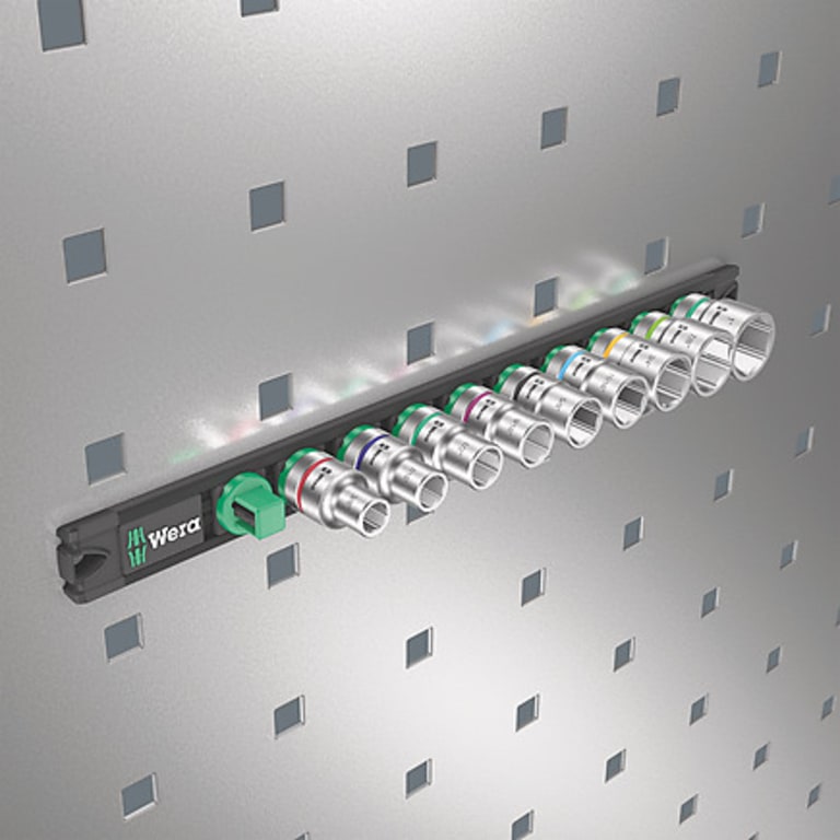 The socket set comes with a socket rail that features secure bit mounting and yet easy removal (twist-to-unlock) for temporary attachment on a wall, shelf, or workshop trolley. This allows you to keep your sockets organized and easily accessible whenever you need them.