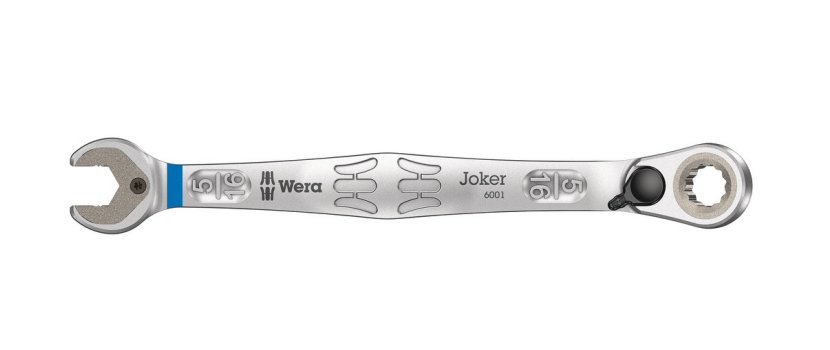 Joker ratcheting combination wrenches with angled ratchet head and switch lever. The metal plate in the jaw provides for the holding function which reduces the risk of losing nuts and bolts. The integrated limit stop can prevent any slipping from the bolt head downwards and enables higher torque to be applied. The exchangeable metal plate in the jaw securely holds nuts and bolts with its extra hard teeth and reduces the risk of slipping. The double-hex geometry delivers a very positive connection with nuts or bolts and again provides for a lower risk of any slipping. The low return angle of only 30° at the jaw end avoids any time-consuming flipping of the wrench when fastening. The reversible ratchet mechanism at the ring end with its fine toothing (80 teeth) ensures great flexibility even in confined spaces. Audibly precise ratchet mechanism. Additionally, the robust two-piece locking element provides for extreme stability. Comes with a 15° angled ratchet end for secure work even at high torque. The specially forged geometry allows for high torque transfer and high flexural rigidity. Manufactured out of high-performance chrome-molybdenum steel with a nickel-chromium coating for high corrosion protection. With the “Take it easy” tool finder: color coding according to size.