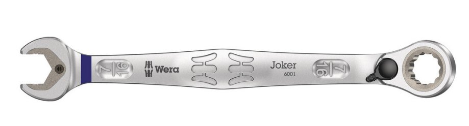 Joker ratcheting combination wrenches with angled ratchet head and switch lever. The metal plate in the jaw provides for the holding function which reduces the risk of losing nuts and bolts. The integrated limit stop can prevent any slipping from the bolt head downwards and enables higher torque to be applied. The exchangeable metal plate in the jaw securely holds nuts and bolts with its extra hard teeth and reduces the risk of slipping. The double-hex geometry delivers a very positive connection with nuts or bolts and again provides for a lower risk of any slipping. The low return angle of only 30° at the jaw end avoids any time-consuming flipping of the wrench when fastening. The reversible ratchet mechanism at the ring end with its fine toothing (80 teeth) ensures great flexibility even in confined spaces. Audibly precise ratchet mechanism. Additionally, the robust two-piece locking element provides extreme stability. Comes with a 15° angled ratchet end for secure work even at high torque. The specially forged geometry allows for high torque transfer and high flexural rigidity. Manufactured out of high-performance chrome-molybdenum steel with a nickel-chromium coating for high corrosion protection. With “Take it easy” tool finder: color coding according to size.