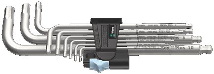 High quality L-key set out of stainless steel for hexagonal socket screws by Wera. Stainless steel prevents the formation of extraneous rust. The Hex-Plus profile offers a larger contact surface within the screw head. This reduces the notching effects to a minimum and almost completely eliminates the risk of destroying the screw recess. Hexagonal ballpoint end on the long arm: the ballpoint drive profile means that it is possible to swivel the tool axis away from the screwdriving axis, thus enabling “round the corner” screwdriving. Comes in a practical clip fastener out of wear-resistant material, enabling secure storage of the L-keys as well as simple removal.