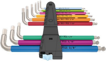 Premium L-key set made of stainless steel for imperial hexagonal socket screws by Wera. Stainless steel prevents transmission of extraneous rust. The Hex-Plus profile offers larger contact surfaces in the screw head. The notch effect is reduced to a minimum and the destruction of the screw head is almost eliminated. With hexagonal ball tip at the long arm: The ball-shaped tip profiles enable the tool shaft to be moved and pivoted relative to the screw axis which allows screwdriving “around the corner”. Take it easy tool finder with colour coding by size. In an almost wear-free L-key clip.