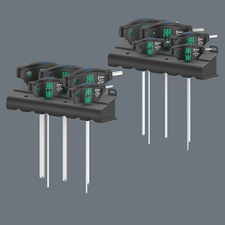 The T-handle design of these screwdrivers enables the transmission of particularly high tightening and loosening torque, making them ideal for heavy-duty applications. Furthermore, the set includes an additional short arm that provides extra leverage for the transmission of extremely high torques.