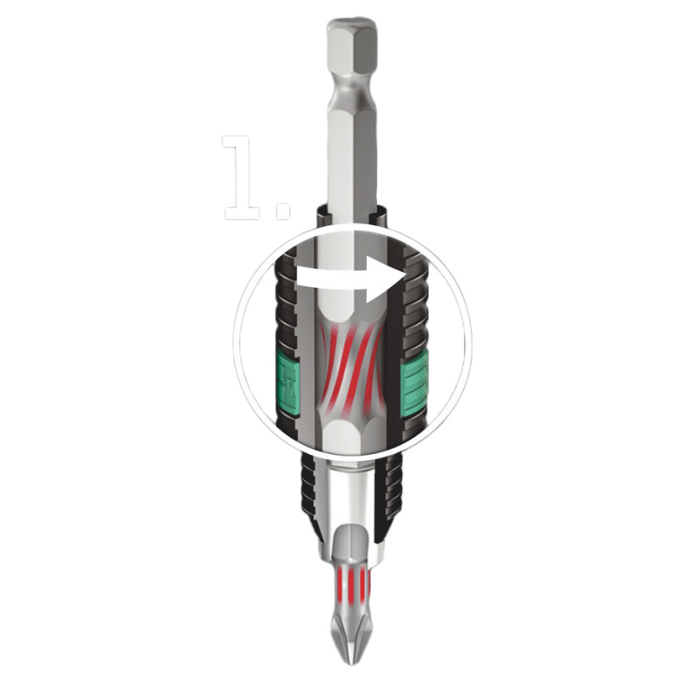 The effectiveness of the BiTorsion system comes from a combination of two shock-absorbing spring elements. Both bits as well as holders have a cushioning torsion zone that diverts the kinetic energy away from the drive tip during peak loads.