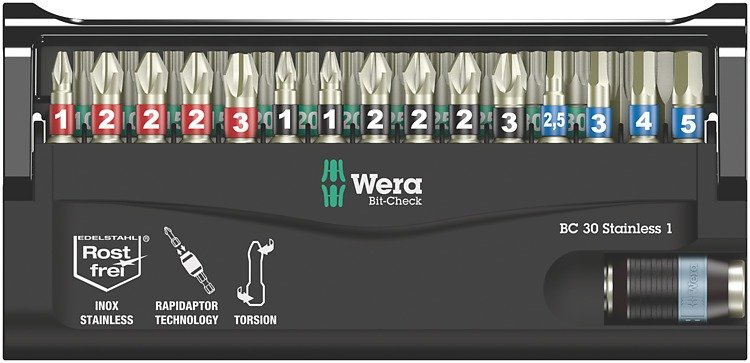 Bit-Check that can be positioned upright with high quality bits out of stainless steel. Wera stainless tools are manufactured out of stainless steel, thus preventing the formation of unsightly extraneous rust. 29 Wera stainless bits. 1 stainless Rapidaptor quick-release holder. The multi-component Bit-Check is convincing on account of its low weight and the maximum possible degree of compactness. In this respect, the soft material in the lower section of the Bit-Check ensures that the bits are securely held whilst being simple to remove at the same time. The profile and size of the bits are easy to recognize thanks to the Wera “Take it easy” Tool Finder with its color coding and clearly visible imprint.