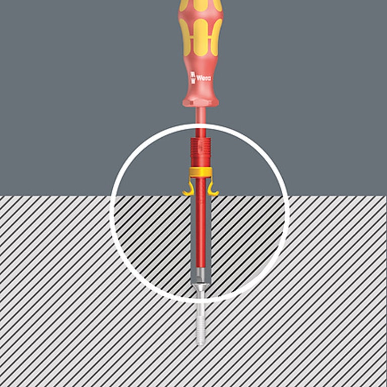 Pull the screw gripper towards the screwdriver handle until the two arms of the gripper sit against the head of the screw and are spread slightly apart. The Wera screw gripper releases the screw automatically after it has been fastened.