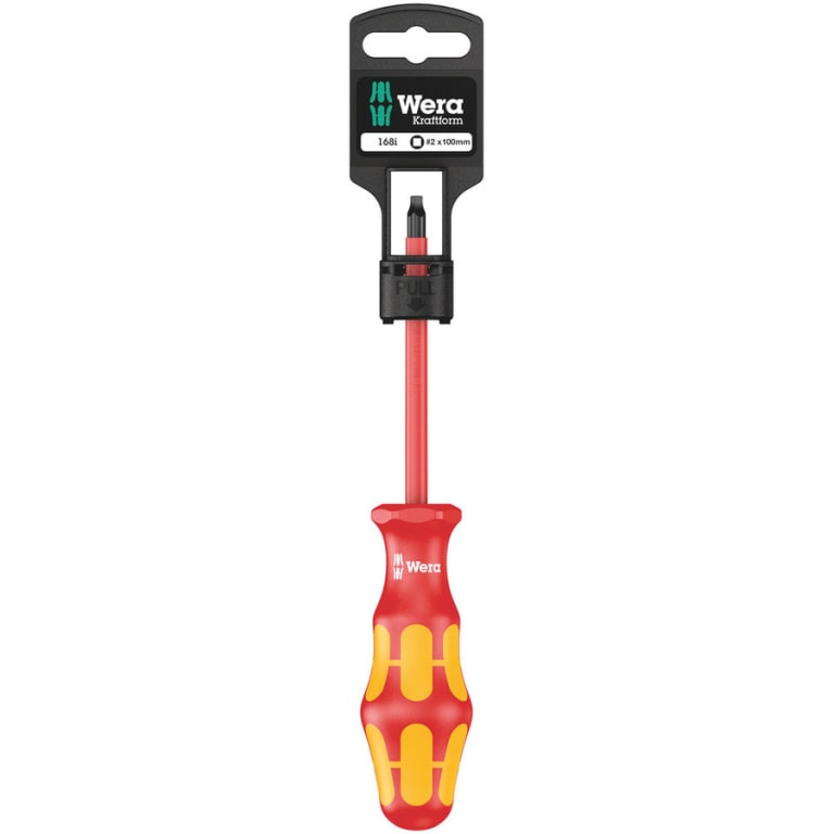 Wera VDE screwdrivers with multi-component Kraftform Plus handle for fast and low-fatigue working: hard gripping zones for high working speeds whereas soft zones ensure high torque transfer. Individually tested in water bath at 10,000 volts for secure work at the permissible voltage of 1,000 volts. The hexagonal anti-roll feature prevents any bothersome rolling away at the workplace.