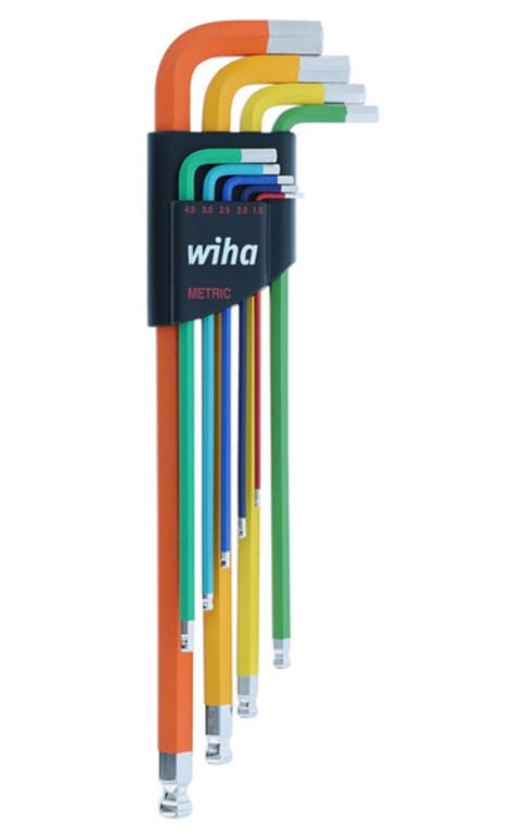 Wiha Color Coded Ball End Hex L-Keys stand out with bright-bold color coding so you can quickly and easily find the right L-Key and feature textured surface shafts for improved grip and slip resistance caused by sweat or oils. Stay organized with the included durable L-Key holder with size call-outs to keep them in order and secure. Ideal for fastening screws in limited access locations or requiring more torque, Wiha Color Coded Ball End Hex L-Keys consist of Wiha premium quality tool steel engineered for strength and durability, boast CNC precision-machined for reduced cam-out, chamfered ends for smooth fastener engagement, no cut off burrs or impact distortions, chrome-plated satin finish for corrosion protection, and include ball end drivers for fastener interlock of up to 25°. Wiha premium quality Color Coded Ball End Hex L-Keys are designed and engineered by Wiha Germany and manufactured in Germany. You can buy with confidence knowing that Wiha stands behind our products with what we believe is the best No Hassle Guarantee in the industry.