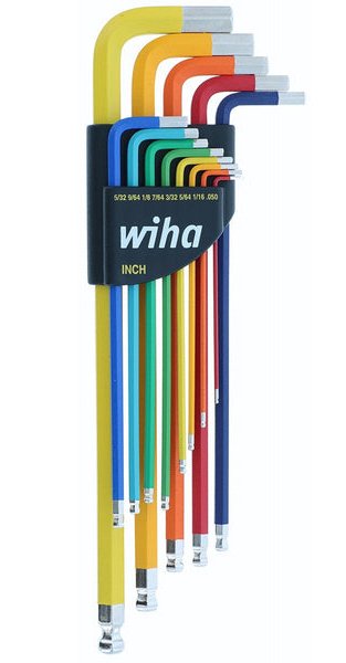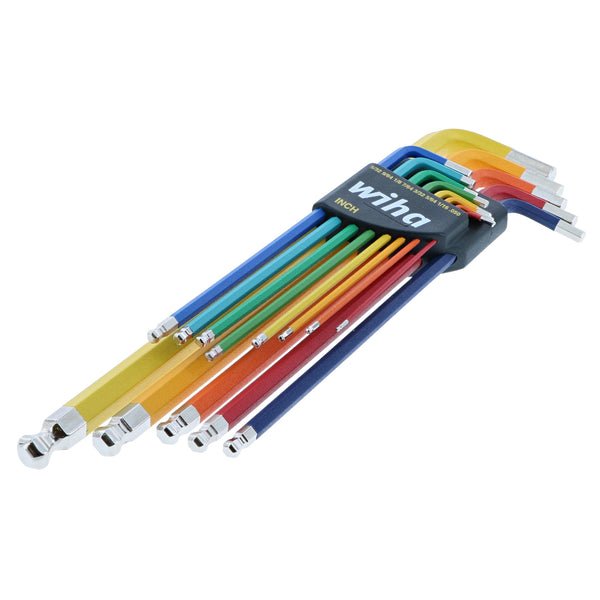 Wiha Color Coded Ball End Hex L-Keys stand out with bright-bold color coding so you can quickly and easily find the right L-Key and feature textured surface shafts for improved grip and slip resistance caused by sweat or oils. Stay organized with the included durable L-Key holder with size call-outs to keep them in order and secure.Ideal for fastening screws in limited access locations or requiring more torque, Wiha Color Coded Ball End Hex L-Keys consist of Wiha premium quality tool steel engineered for strength and durability, boast CNC precision-machined for reduced cam-out, chamfered ends for smooth fastener engagement, no cut off burrs or impact distortions, chrome-plated satin finish for corrosion protection, and include ball end drivers for fastener interlock of up to 25°. Wiha premium quality Color Coded Ball End Hex L-Keys are designed and engineered by Wiha Germany and manufactured in Germany. You can buy with confidence knowing that Wiha stands behind our products with what we believe is the best No Hassle Guarantee in the industry.