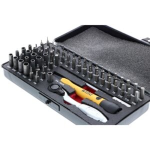 The Wiha master technicians tool set has the tools to get the job done. The set contains common tools for technicians: Micro Bits, 72 Tooth Mini Ratchet, ESD Safe Precision Handle, Micro Bit Extension, 1/4″ to 4mm Adapter, Slotted, Phillips, Hex Inch Metric, Torx, Nut Driver Inch Metric, Pentalobe Micro Bits. All of the tools come conveniently packaged in a secure clasped metal case with a labeled foam tray for easy identification and storage.