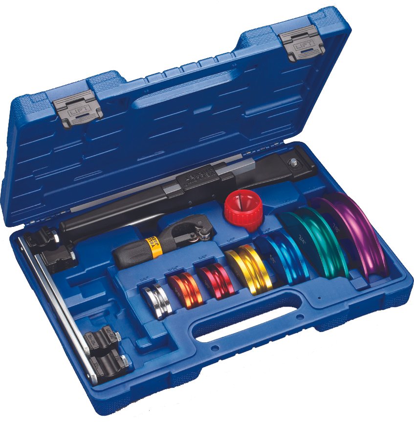 The YELLOW JACKET® Alloy Ratchet Tube Bender Kit creates smooth and consistent bends when working with 1/4″ to 7/8″ soft copper, aluminum and light wall hydraulic tubing. The mandrel attachment ball-detent feature and color-coded mandrels make it easy to switch between different tubing sizes. The simple, yet powerful ratcheting mechanism is easy to actuate.